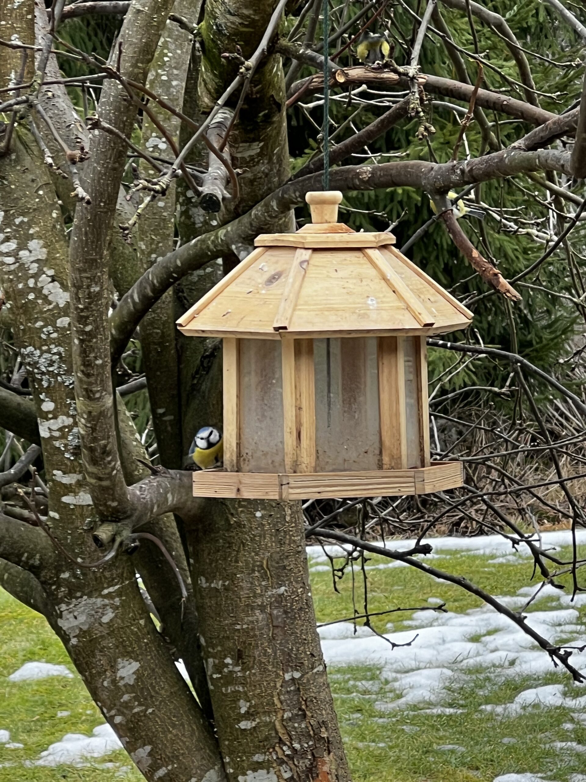 Pihassani omenapuussa roikkuu lintujen ruokintamökki. Se on sellainen puinen ruokintakoppi, jossa on katto ja lasiset seinät. Siemenet ovat kopin sisällä ja linnut syövät niitä ulkopuolelta aukkojen kautta. Koko talven siinä on ollut vilskettä. Sinitiaisia, talitiaisia, varpusia ja kaikenlaisia lintuja. Ja tietysti oravia. Se on yksi lempinäkymistäni talvella, ja voisin katsella lintujen puuhastelua vaikka kuinka pitkään.
